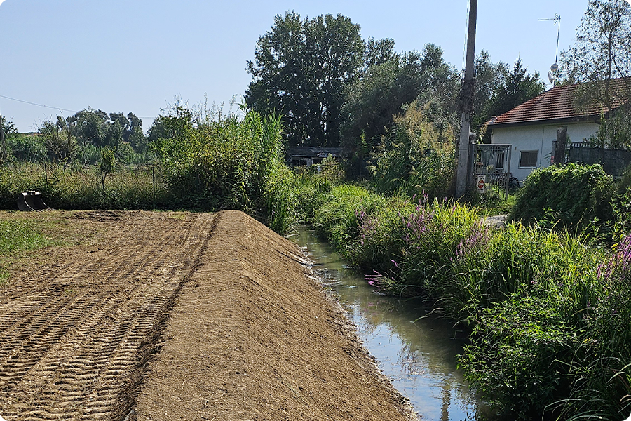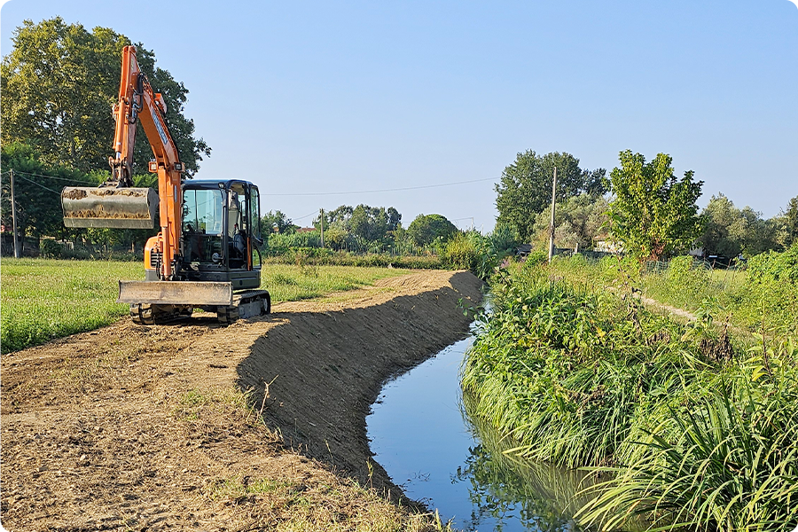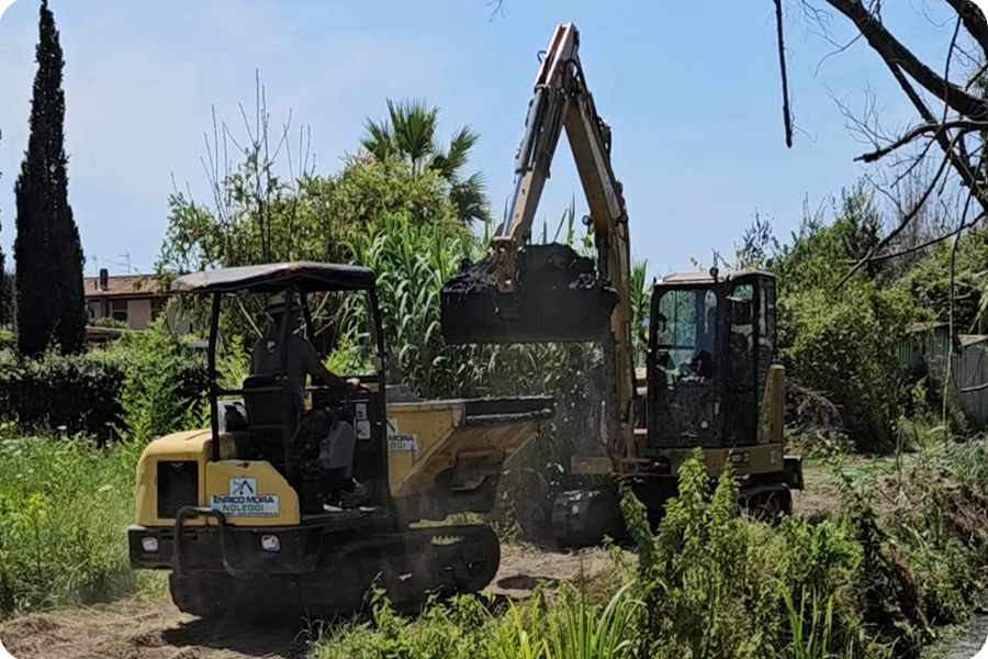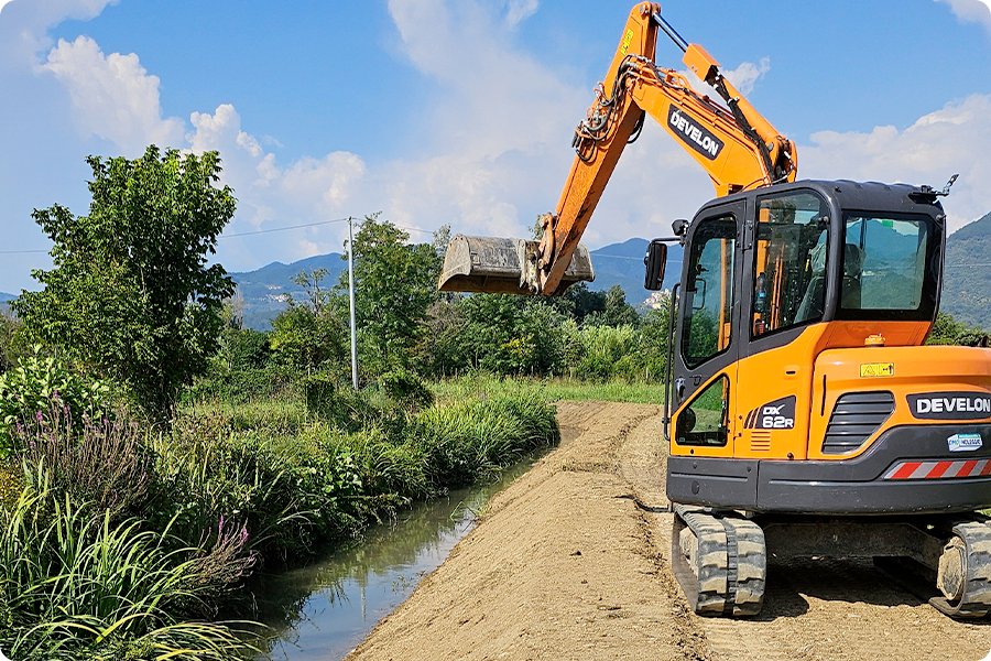 Cantiere di Marina di Carrara con CAT 306 e Develon DX62R ripristino argini e pulizia alveo canali